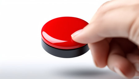 A close-up of a finger poised above a vivid red button on a sleek blue background, capturing tense anticipation and the moment before urgent intervention.