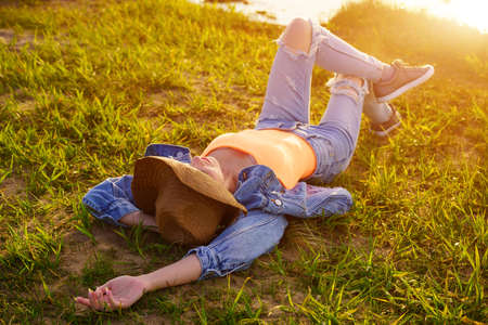 young beautiful girl in a denim jacket and jeans lezhin on green grass by the river on a summer sunny day