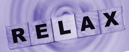 Relax - an inscription on wooden cube blocks on sunny beach beckground with reflection. Reduce stress mental health concept