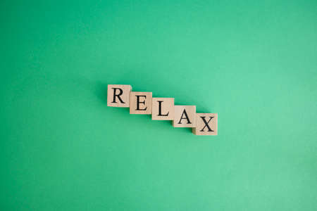 The word relax made from wooden cubes. The background is green and photographed in the studio. Rest and calm concept.