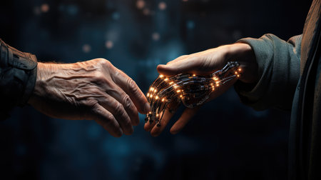 Human hand touching an cyborg finger about to touch human finger on dark background - Futuristic concept with copy space