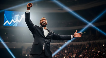 An ecstatic businessman in a suit celebrates triumphantly on a stage, with one fist raised in the air, in front of a massive audience in an arena. Bright spotlights and a screen showing a rising graph in the background emphasize his success, achievement, and leadership.