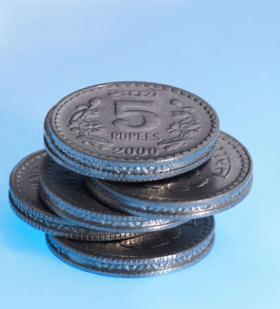 Money, Business and Risk Concept. Closeup of stack of coins on blue background with copy space.