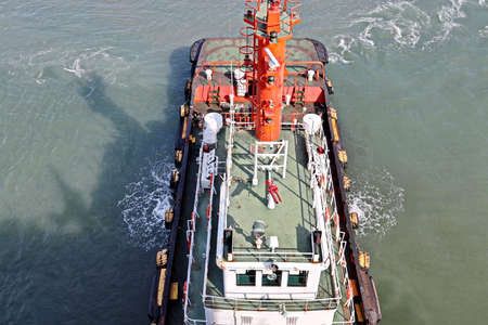 The pilot boat orange goes to meet the vessel on the outer roads. Helicopter view. Top view of the sea