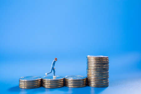 Sport, Money and saving concept. Closeup of runner miniature figure people run on top of stack of coins on blue background.