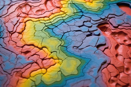 This striking abstract artwork features a colorful topographic relief model, showcasing dynamic textures and layered designs that represent landscapes and mountains.