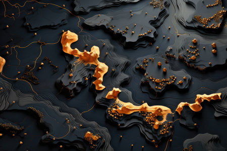 This artistic relief map showcases the world in a striking golden texture set against a deep dark background, perfect for design and educational use.
