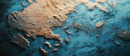 A 3D world map rendered in shades of blue and gold, with a textured, almost organic look.