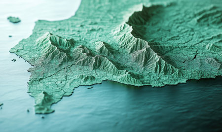 Coastal mountain range aerial view, textured map, ocean background, geography lesson