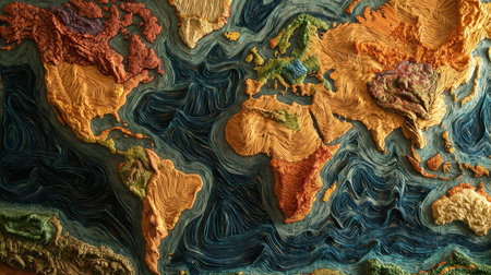 This vibrant three-dimensional relief map of the world highlights continents and oceans with intricate textures. Perfect for educational purposes, art appreciation, and global exploration.