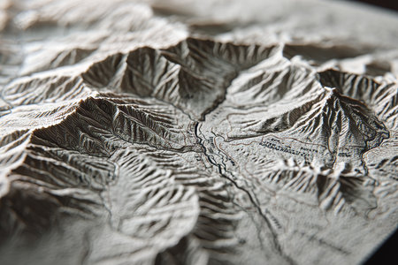Intricate close up of a topographic map highlighting mountainous terrain and natural features