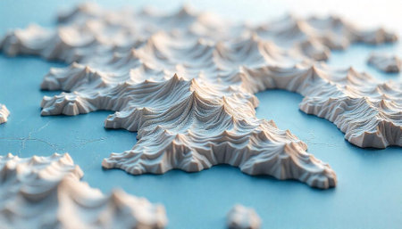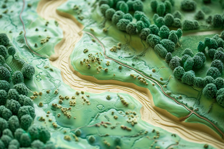 An abstract illustration presents a topographic map with layered contours and varied colors. The image showcases a three-dimensional effect, using shades of green, orange, and brown, suggesting a landscape. This art piece could be suitable for design projects, educational materials, or presentations related to geography and cartography.