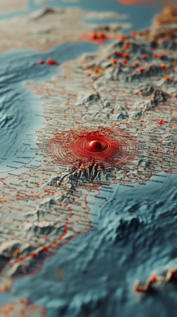 Concentric red circles radiating from a central point on a detailed topographic map illustrate seismic wave propagation during an earthquake, emphasizing geological impact and destruction