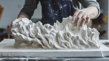 An expert stone carver skillfully smooths the rough edges of an intricate sculpture, showcasing fine detail and artistry in a bright studio environment.