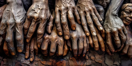Miniature Workers in safety helmets waving their fists and protesting. International labor day concept. Generative ai.