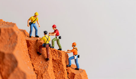 Four tiny construction workers are skillfully climbing a steep, orange-colored slope. They wear colorful hard hats and are focused on reaching the top in a scene filled with determination.