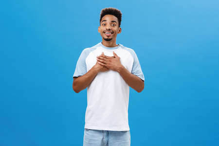 Studio shot of poud and grateful friendly-looking charming dark-skinned male with beard holding hands on breast smiling with pleased look and gazing at camera thanking for help over blue wall
