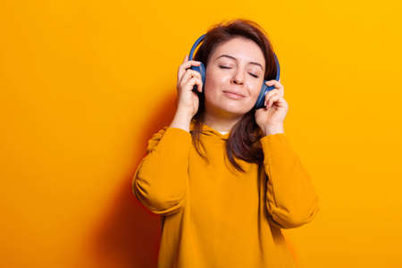 Relaxed caucasian woman enjoying music on headphones. Positive adult listening to sounds and using headset to have fun at photoshoot in studio. Young person relaxing with audio.