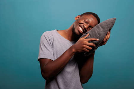 Relaxed adult putting head on comfortable pillow to sleep and take nap in studio. Exhausted guy trying to get rest after passing bedtime and dealing with insomnia, sleeping schedule.