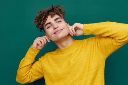 a handsome man stands on a green background in a yellow sweater and pulls his ears to the sides . Horizontal photo with empty space