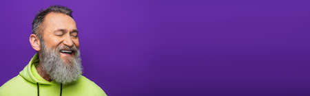 joyful senior man with beard and grey hair smiling with closed eyed on purple, banner