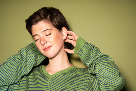 pleased woman in stylish striped jumper holding hands behind neck and smiling with closed eyes on green background