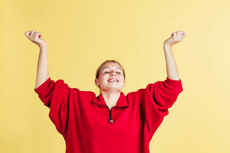 One smiling cute girl with freckles raises her hand and rejoices isolated on yellow studio background. Concept of emotions,