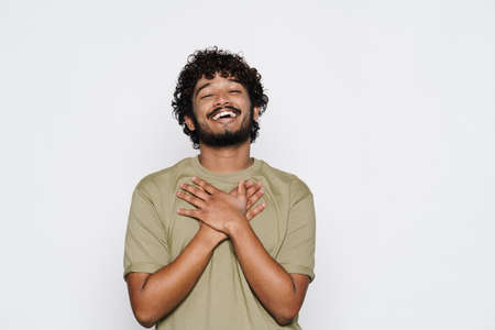 Young middle eastern man smiling and holding hands on his chest isolated over white wall
