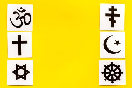 World religions concept. Christianity, Catholicism, Buddhism, Judaism, Islam symbols on yellow background top view copy space