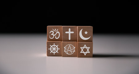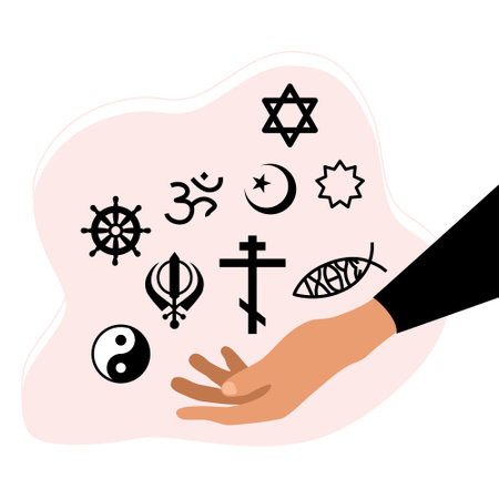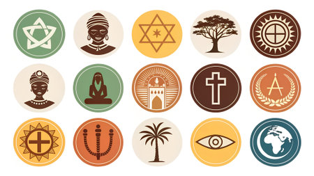 Stock illustration featuring religious symbols from various faiths on a neutral background, with copy space. Concept of harmony, coexistence, and interfaith dialogue for a world united in diversity.