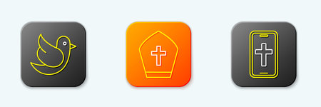 Set line Dove, Pope hat and Christian cross on phone icon. Vector.