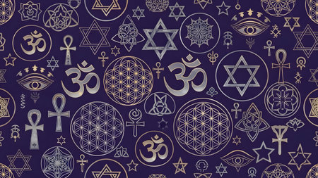 A diverse collection of spiritual symbols and sacred geometry patterns, including the om symbol, star of david, and other mystical icons on a dark blue background.