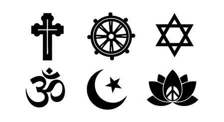 Collection of spiritual icons representing major world religions including Christianity, Hinduism, Judaism, Islam, and Buddhism in black silhouette style. Calm and respectful mood.