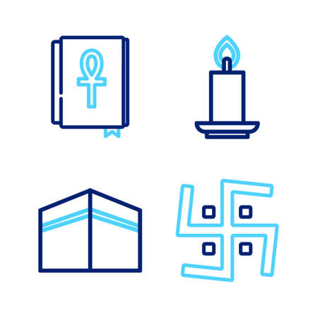 Set line Hindu swastika, Kaaba mosque, Burning candle and Cross ankh book icon. Vector