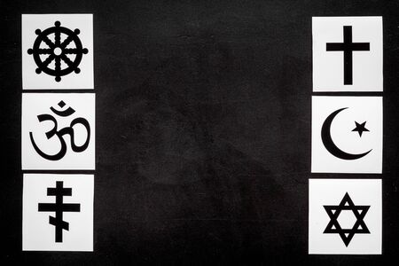 World religions concept. Christianity, Catholicism, Buddhism, Judaism, Islam symbols on black background top view copy space