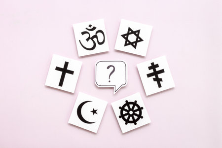 World religious symbols - Christianity cross, Islam crescent, Buddhism dharma wheel, Hinduism aum, Judaism David star top view.