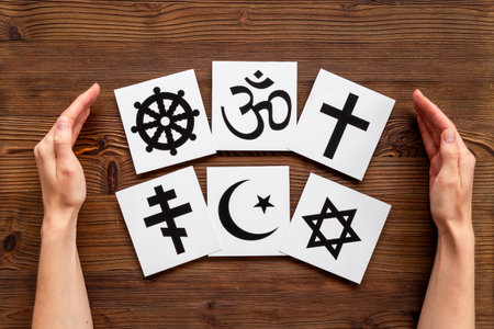 World religions concept. Hands hugs Christianity, Catholicism, Buddhism, Judaism, Islam symbols on white background top view