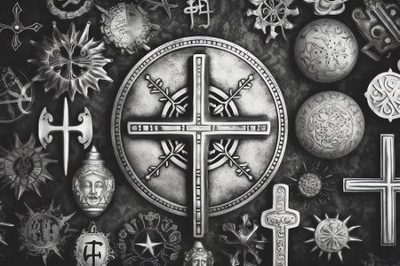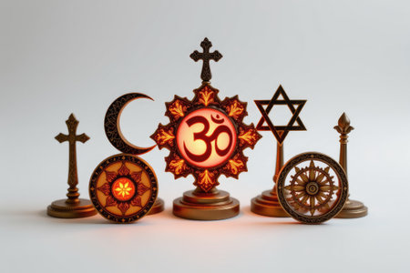 This artistic image features a captivating arrangement of diverse religious symbols, representing unity and spirituality, illuminated with a warm glow.