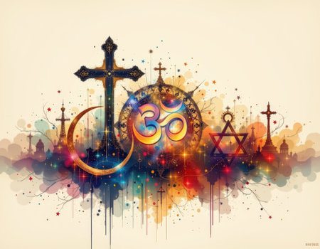 This visually striking image showcases diverse religious symbols in vibrant colors, representing unity among various faiths. An artistic depiction celebrating spiritual diversity.