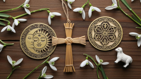 Occult symbols, snowdrops, rustic table. Pagan, sun, moon, lamb.
