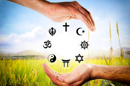 Hands encompassing symbols of the most representative religions with a nature background. Landscape composition.