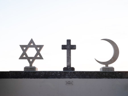 Generative AI : Christianity Islam Judaism 3 monotheistic religions Jewish Star Christian and Orthodox crosses and Crescent and star Interreligious or interfaith symbols
