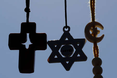 Christianity, Islam, Judaism 3 monotheistic religions. Jewish Star, Cross and Crescent: Interreligious symbols.
