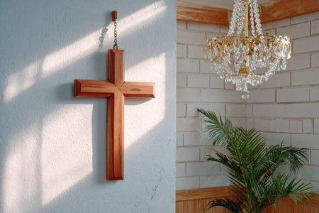 Wooden cross hanging on a white wall with sunlight and a chandelier