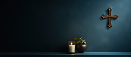 Serenity and reflection with candles and cross in peaceful setting.