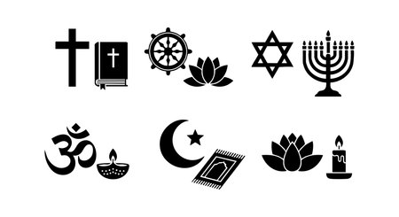 Collection of spiritual icons representing major world religions including Christianity, Hinduism, Judaism, Islam, and Buddhism in black silhouette style. Calm and respectful mood.