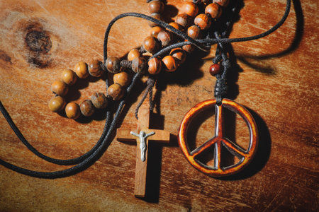 Symbol of peace and the Crucifix on wooden table