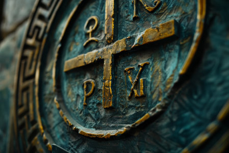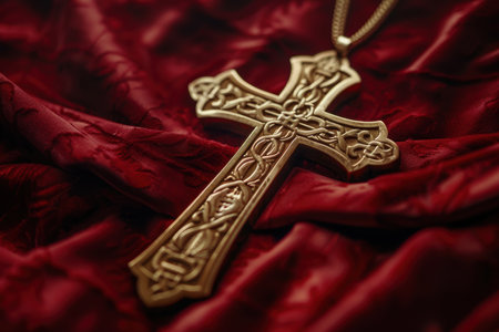 Ornate gold pectoral cross lies elegantly on rich red velvet fabric, with intricate engravings shimmering under soft light. the religious symbol's craftsmanship and elegance are highlighted, emphasizing its spiritual and historical importance.