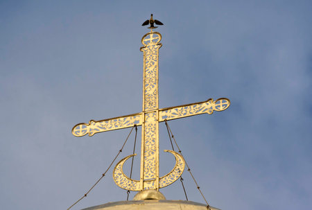 Orthodox church cross against the blue sky. A swallow sits on a cross. Easter concept.
