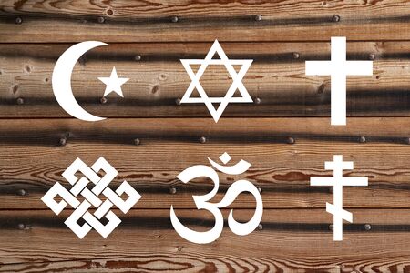 Symbol of different religions on a wooden background
